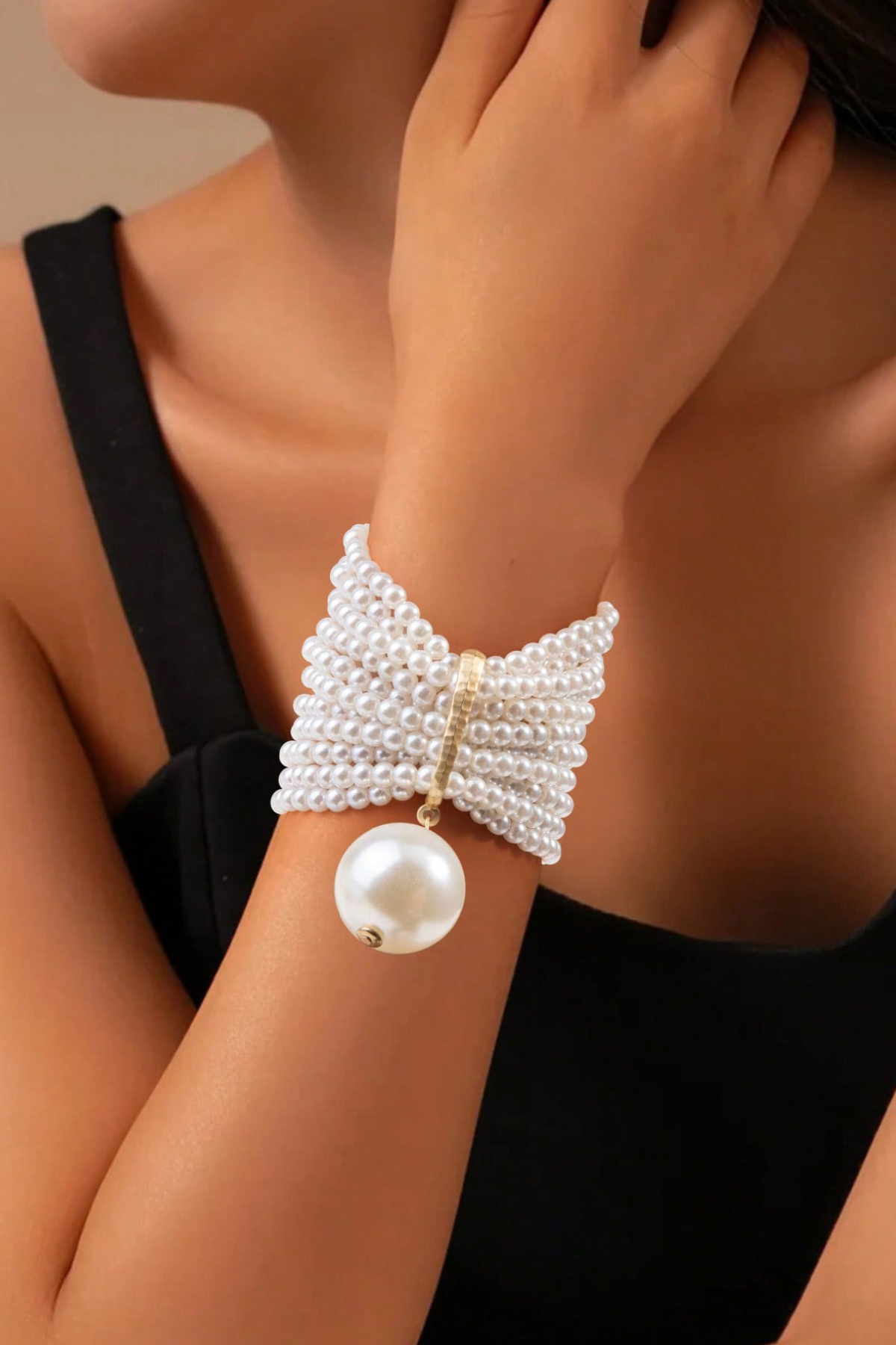 Apyrankė, kuri pastebima iš tolo; daug mažų perliukų juostelių, kurias vainikuoja vienas didelis perlas. Perliukai suverti ant elastinio siūlo. Elegantiška, proginė apyrankė, puikiai tiks vakarui prie bet kokios vakarinės suknelės. Tiks ir nuotakai pasipuošti. Išmatavimai;