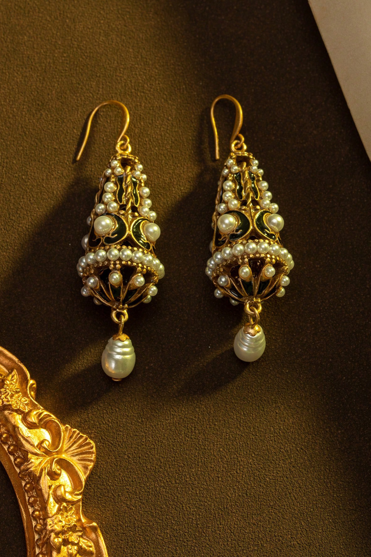 Vintažinio stiliaus, masyvūs auskarai. Auskarai lašo formos, puošti perlų masės karoliukais. Puikus, ryškus akcentas prie vienspalvės vakarinės suknelės. Išmatavimai;