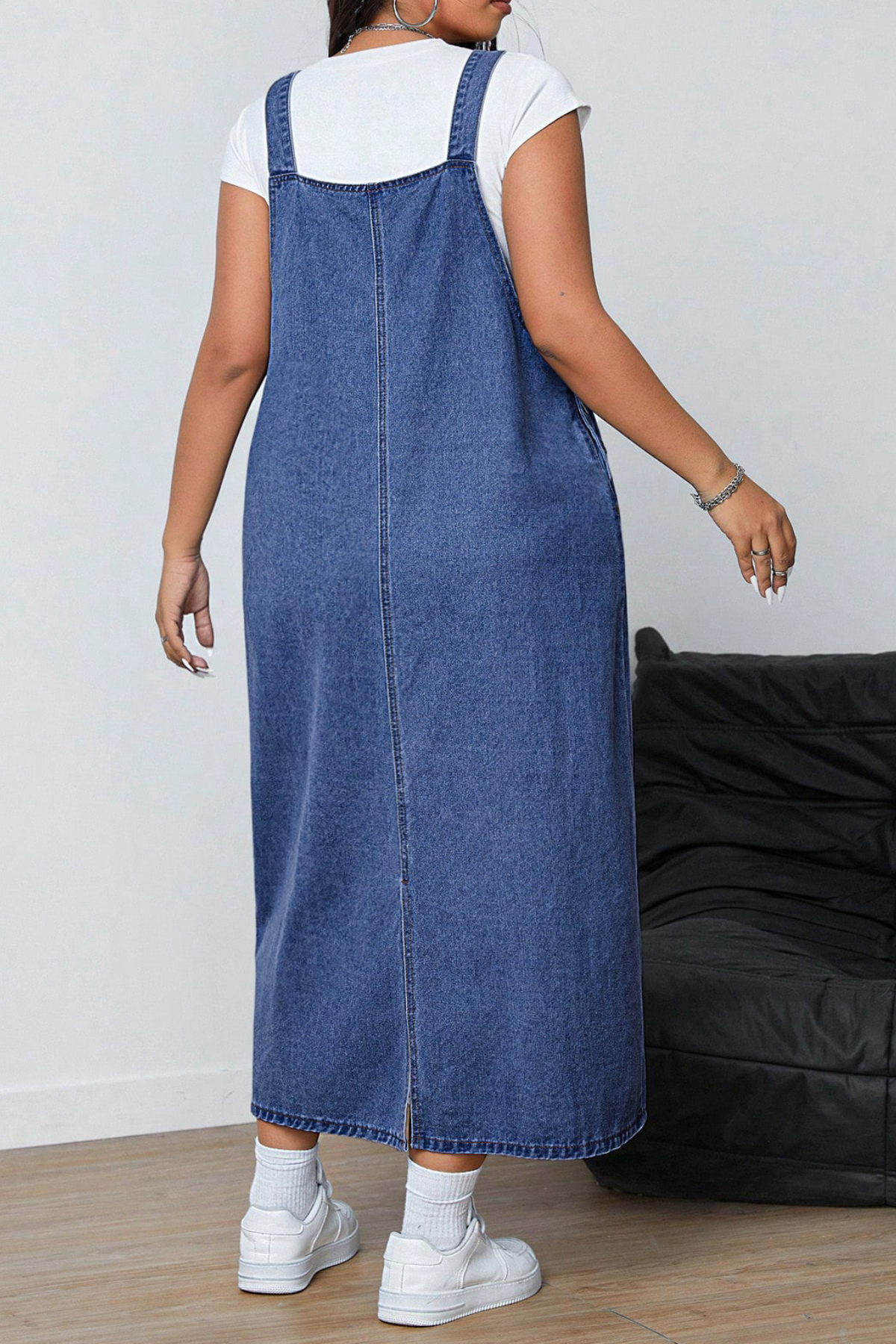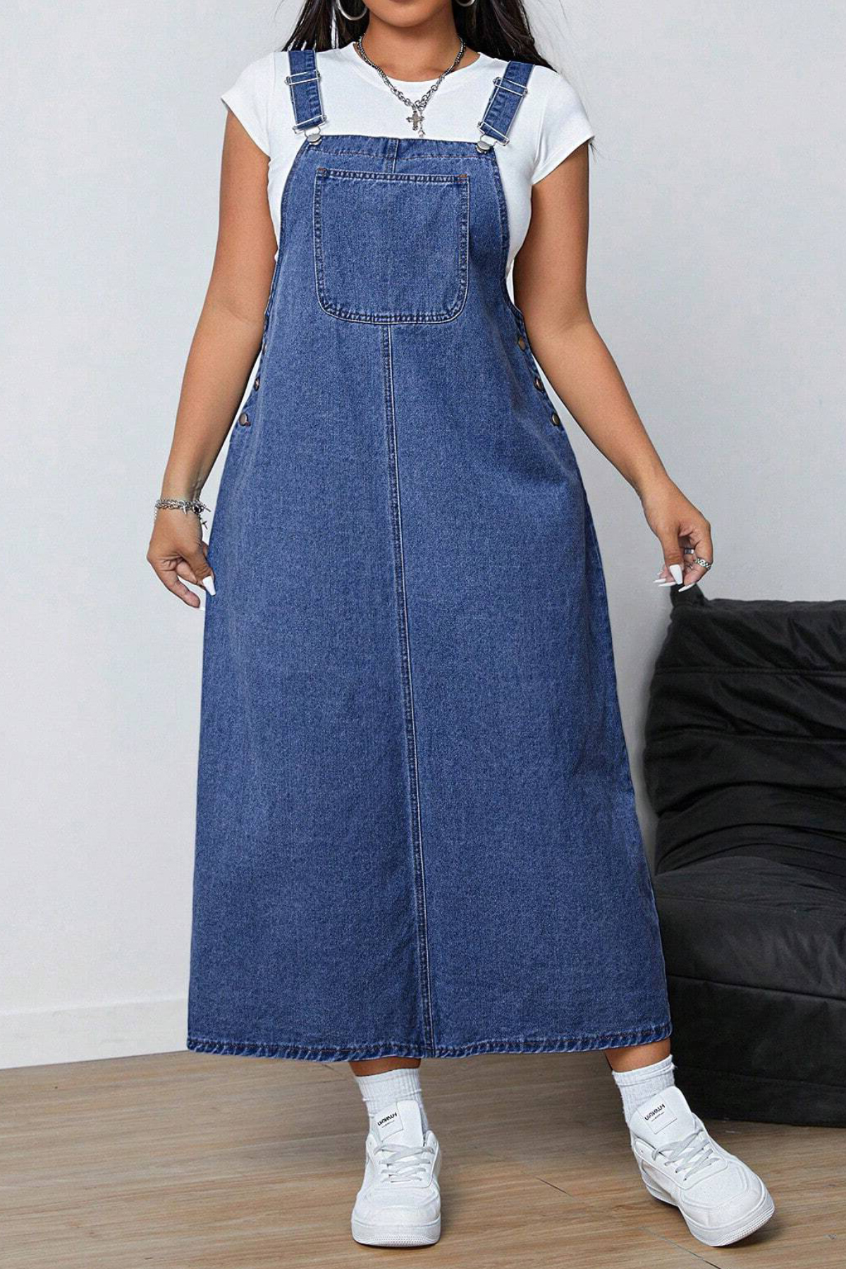 Džinsinis sarafanas su petnešomis didelio plius dydžio apkūnioms moterims. Šonuose trys metalinės sagos, liemuo platus, ilgis midi, spalva – vidutinė mėlyna. Priekyje viena didelė kišenė ant krūtinės. Džinsas nėra storas, tinka ir vasarai. Puikus kasdienis rūbas. Išmatavimai;