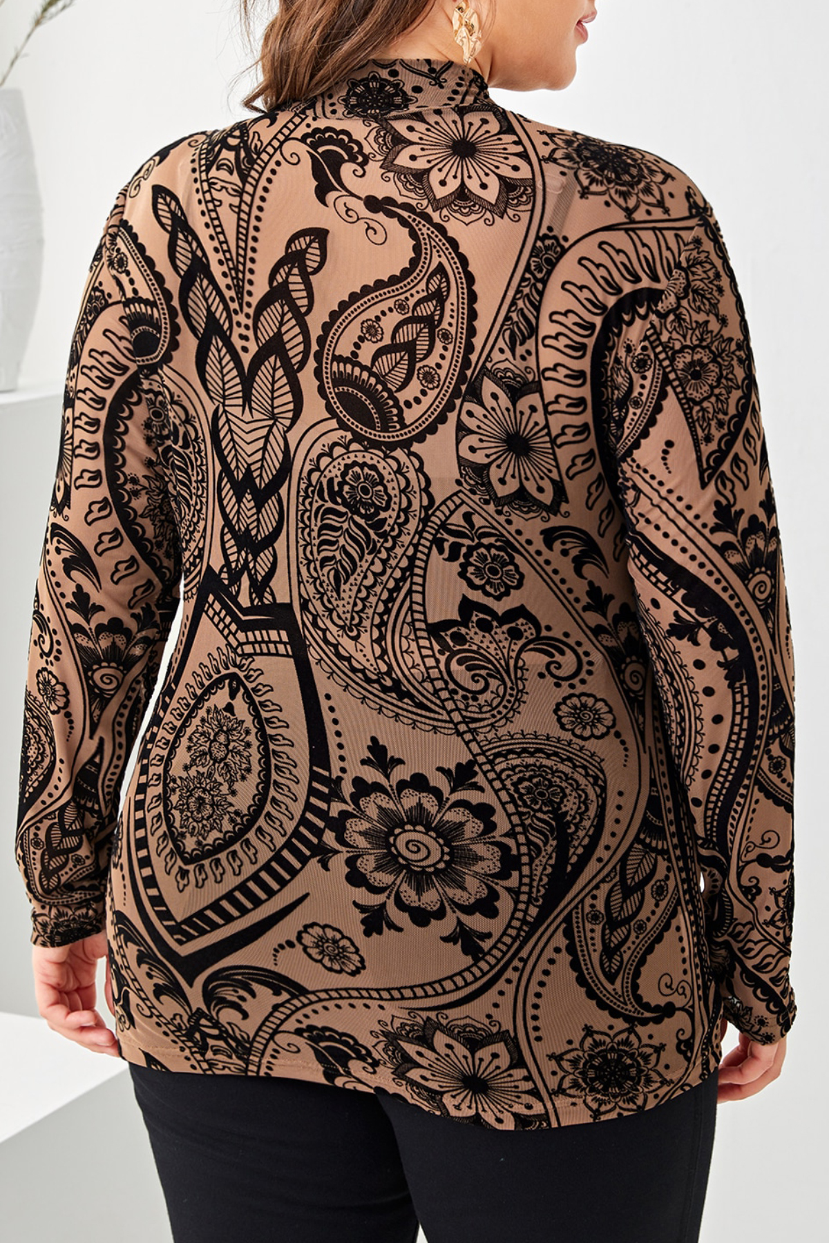 Plonas, tamprus, rusvos spalvos trikotažo golfas didesnio dydžio atrodo efektingai; golfas apgula kūną ir atrodo, kad ant jūsų kūno pilna tatuiruočių. Golfas stačiu kaklu, ilgomis rankovėmis puikiai atrodo su tamsiomis kelnėmis ar džinsais. Raštas, kiekvienu atveju, išsidėsto skirtingai. Skalbti rankomis, lyginti be karščio. Išmatavimai;