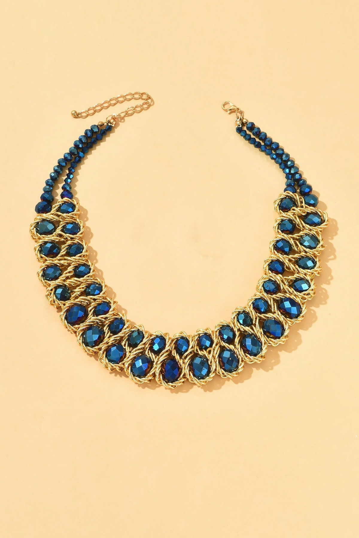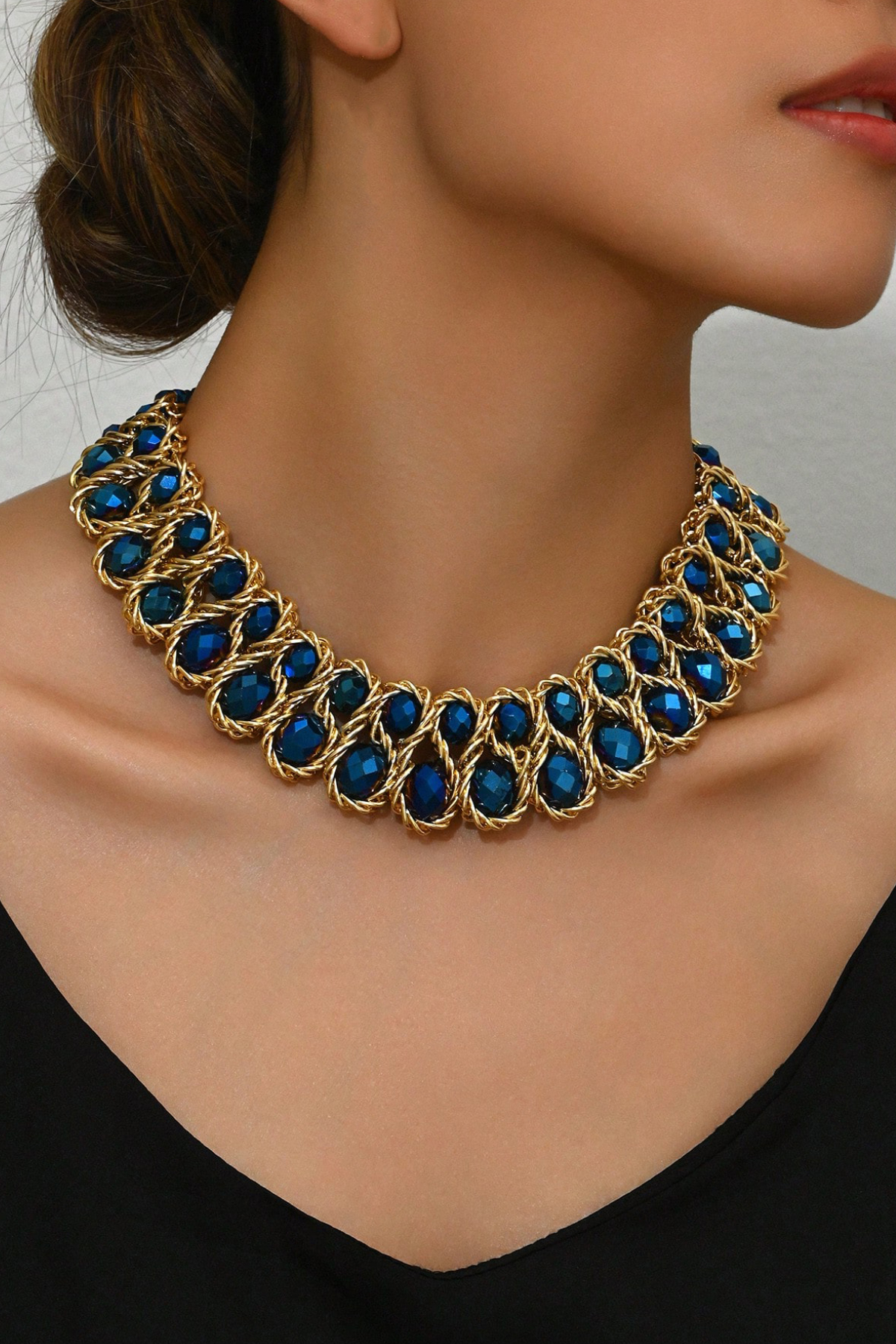Proginis vėrinys iš tamsiai mėlynų facetuotų karoliukų. Įdomi vėrinio suvėrimo technologija, ryški spalva. Vėrinys papuoš bet kurią vienspalvę proginę suknelę. Išmatavimai;