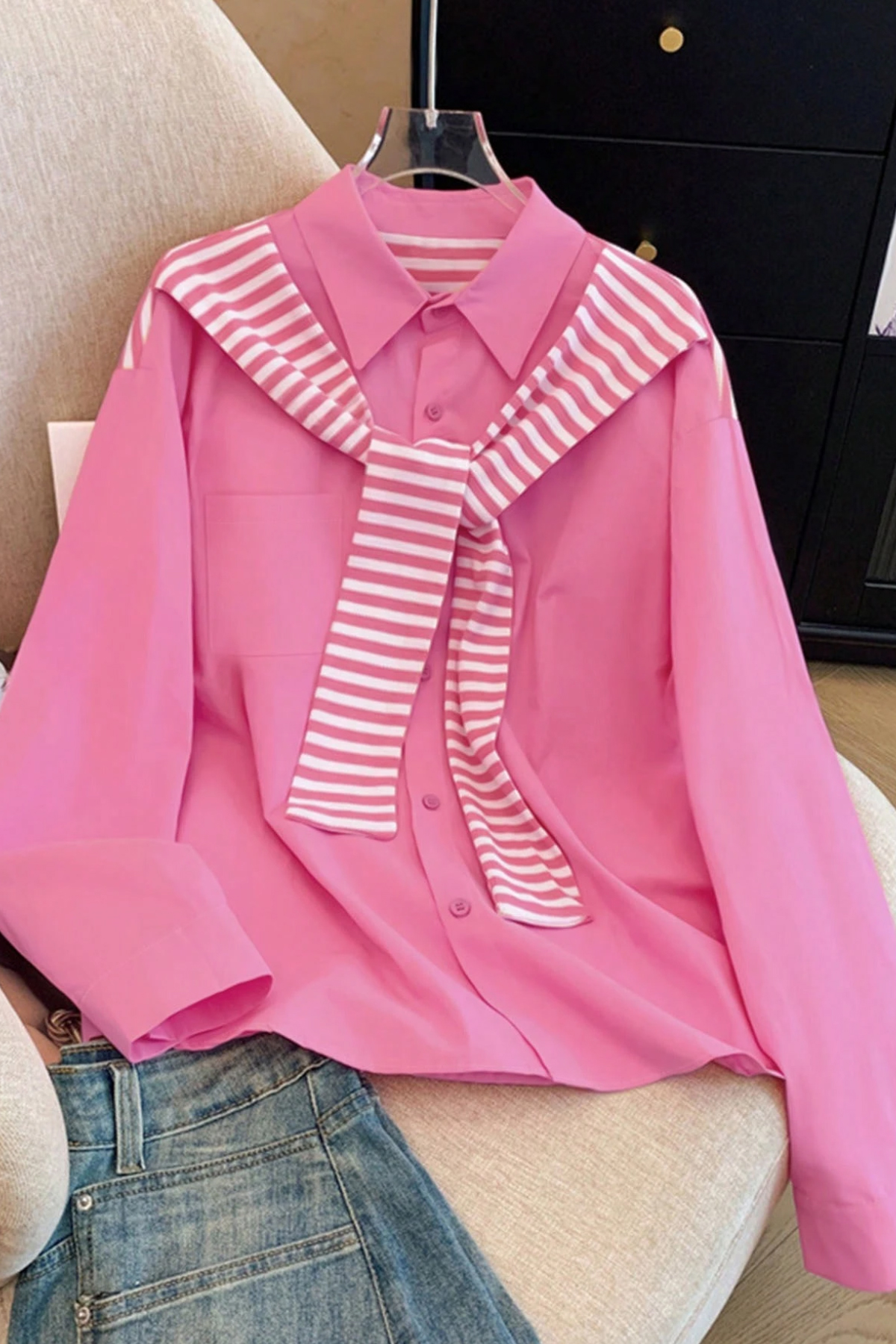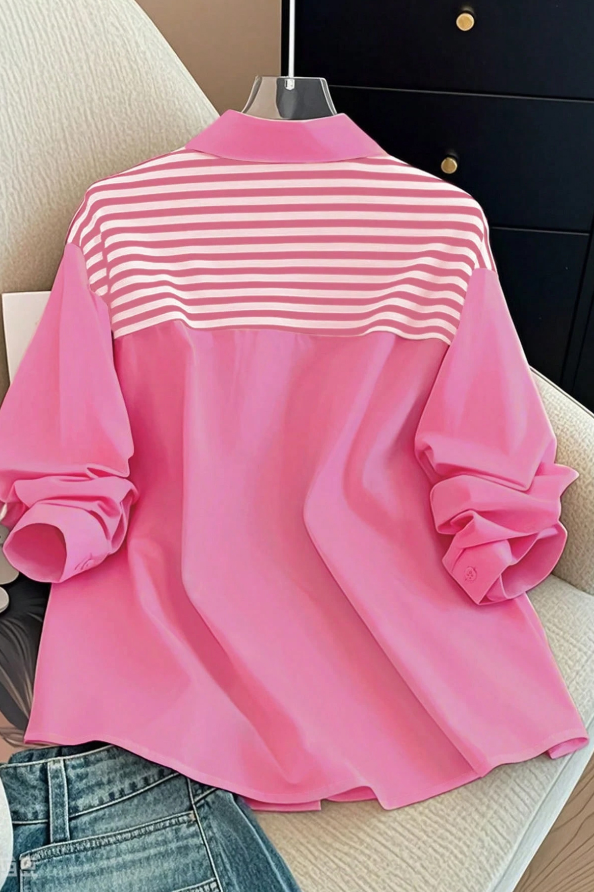 Rožiniai, plono audinio marškinukai, puošti ruožuotu trikotažu, susagstomi sagutėmis. Marškinukai puikiai tiks laisvalaikiui, kelionėje, vasaros piknikui gamtoje, kasdien mieste. Išmatavimai;