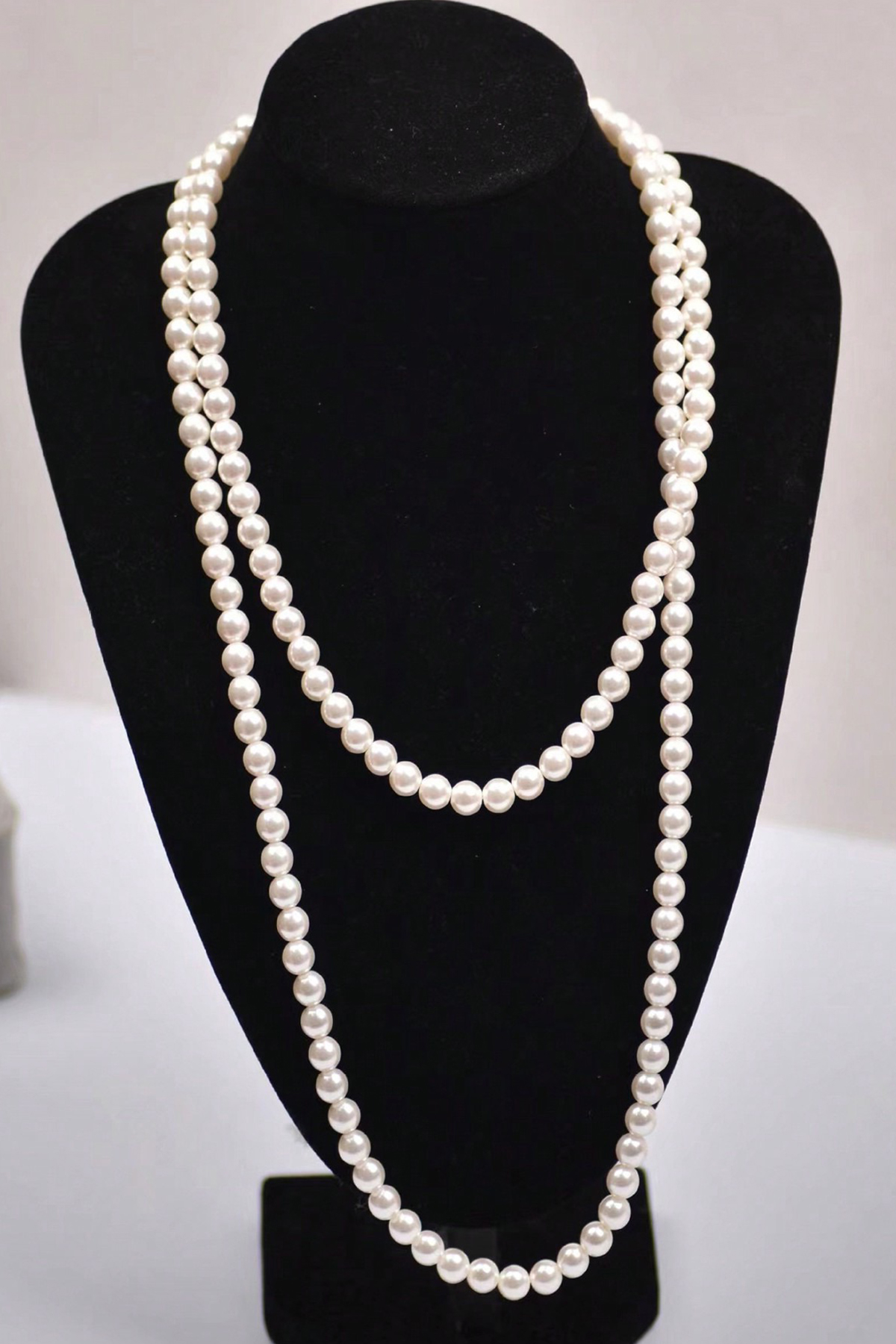 Baltų, perlų masės, ilgas vėrinys be užsegimo. Puikiai tiks prie juodos suknelės ar ryškios palaidinės.