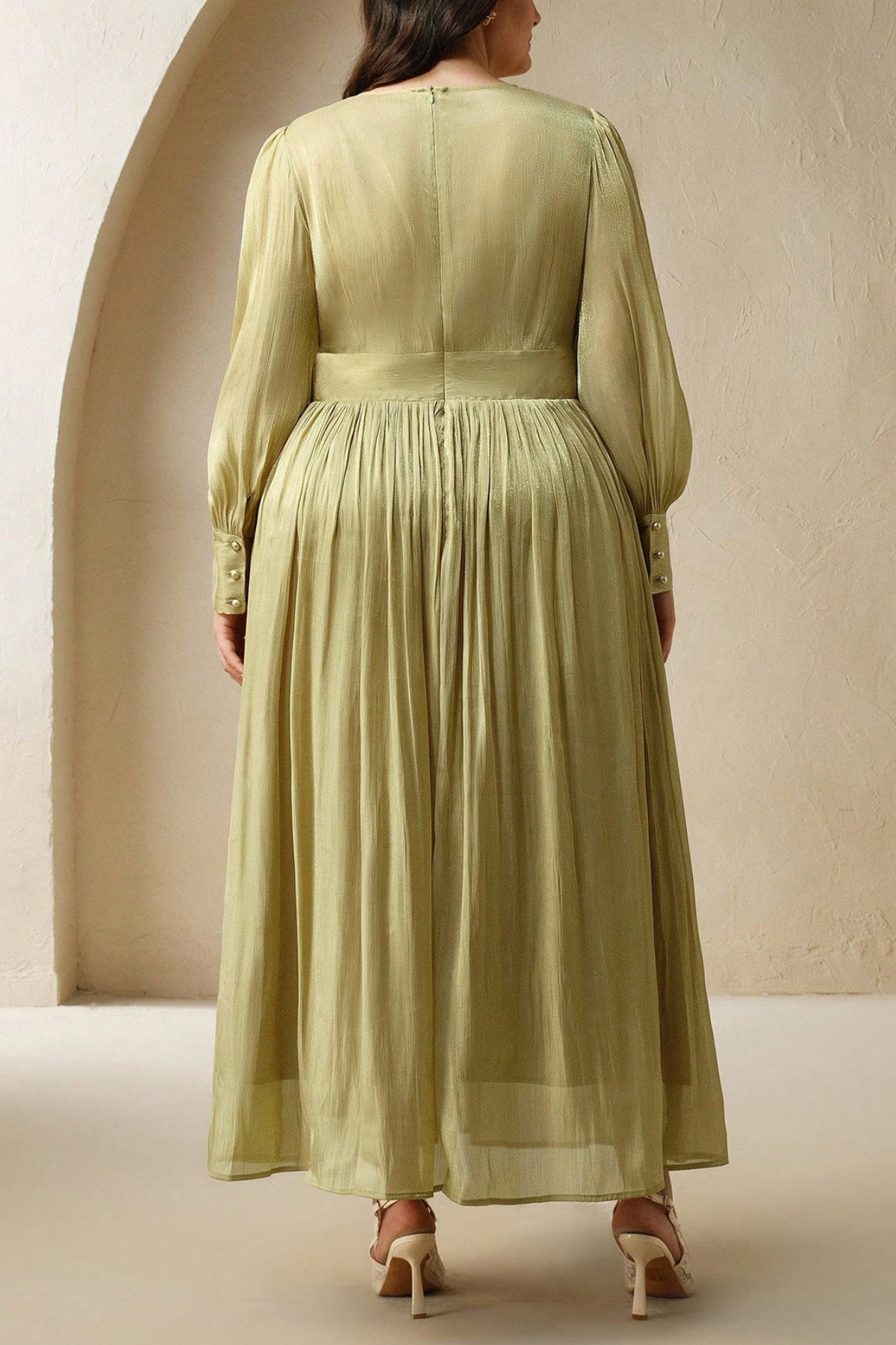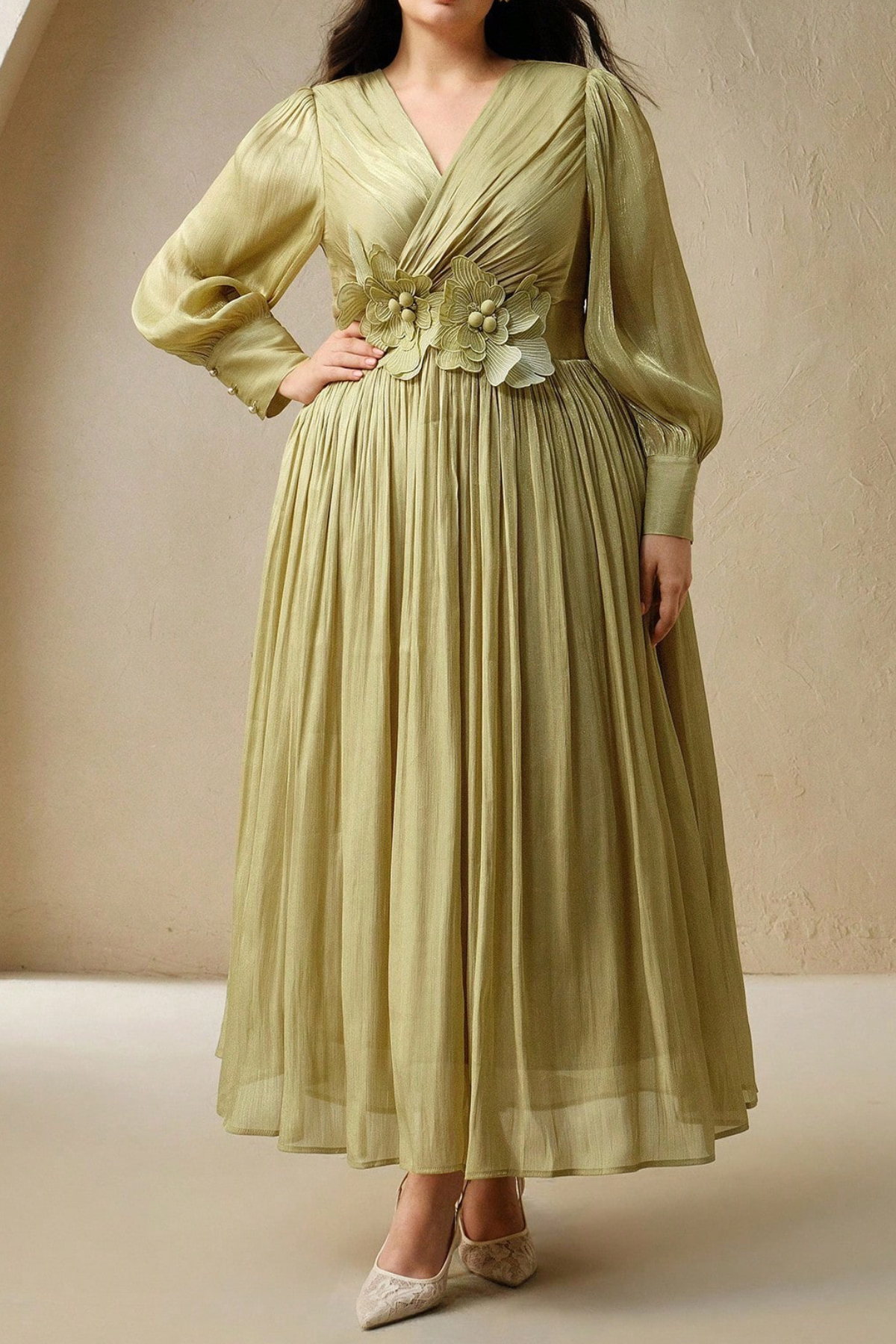 Ilga, proginė suknelė su gėlių aplikacija ant liemens. Suknelė su ilgomis rankovėmis, liemenuota, nugaros pusėje – užtrauktukas. Šviesi, pastelinė, žalsvai geltona spalva primena atsigaunančią pavasario pievą. Suknelė nedaug puošta kristalais. Suknelė tiks stambesniam liemeniui. Išmatavimai;