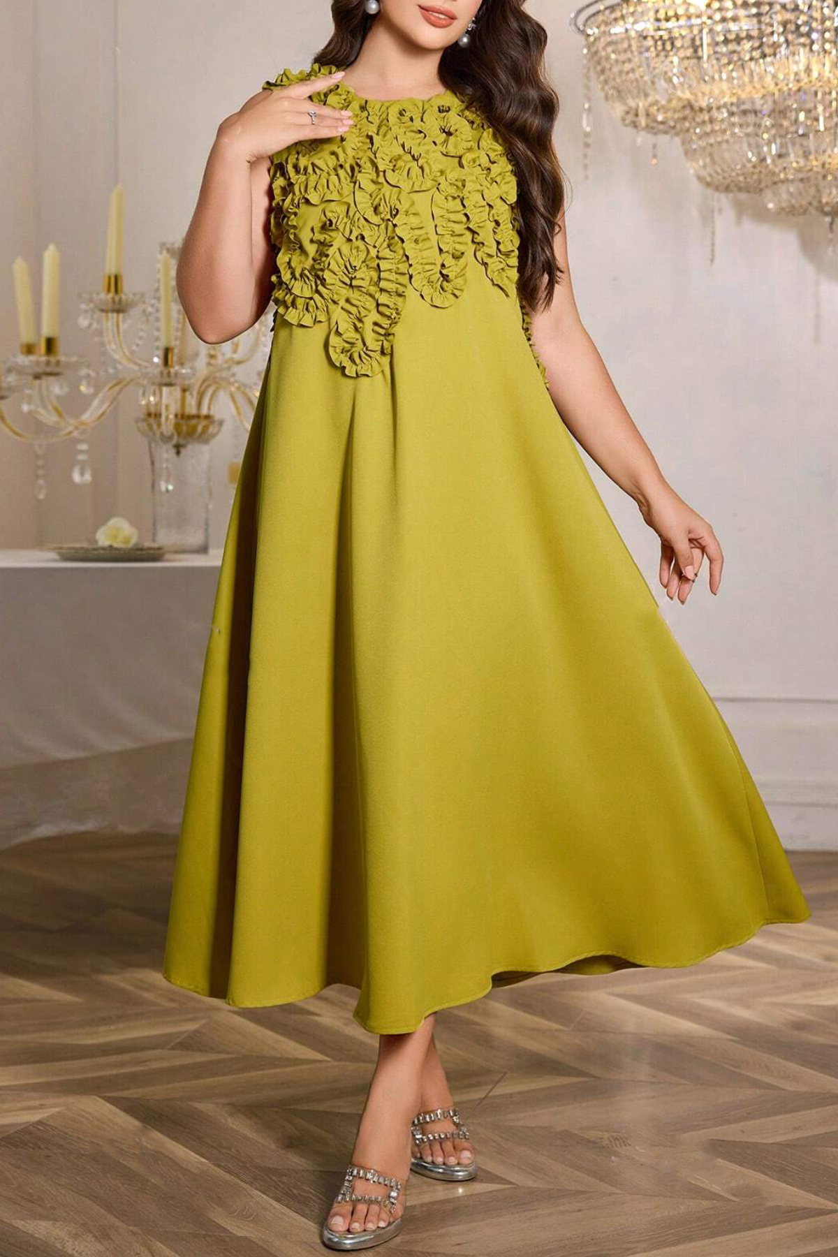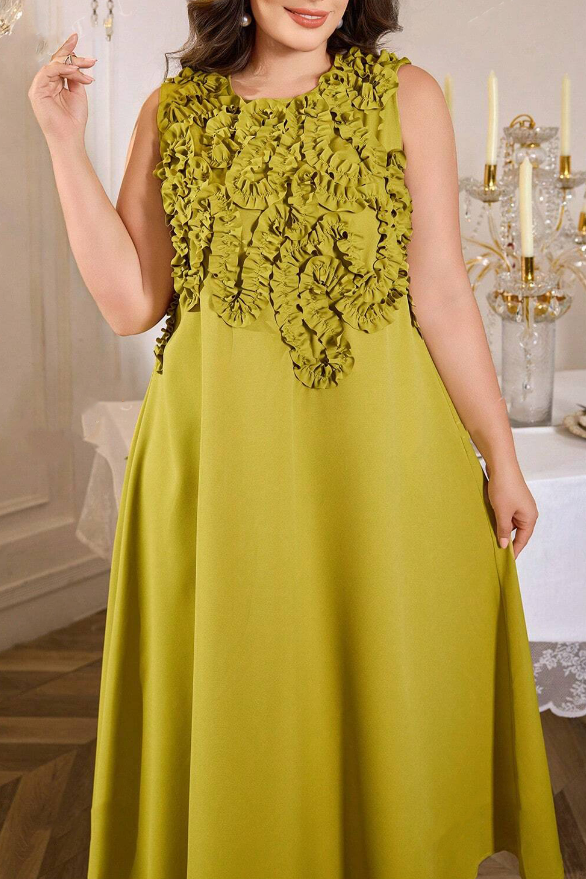 Alyvuogių spalvos ryški suknelė. Suknelė platėjančio, berankovio modelio, beveik maxi. Suknelės priekis puoštas sutraukta juosta originaliu ornamentu. Suknelės vientisa, sodri spalva ir originalus papuošimas ant krūtinės suteikia suknelei elegancijos. Išmatavimai;