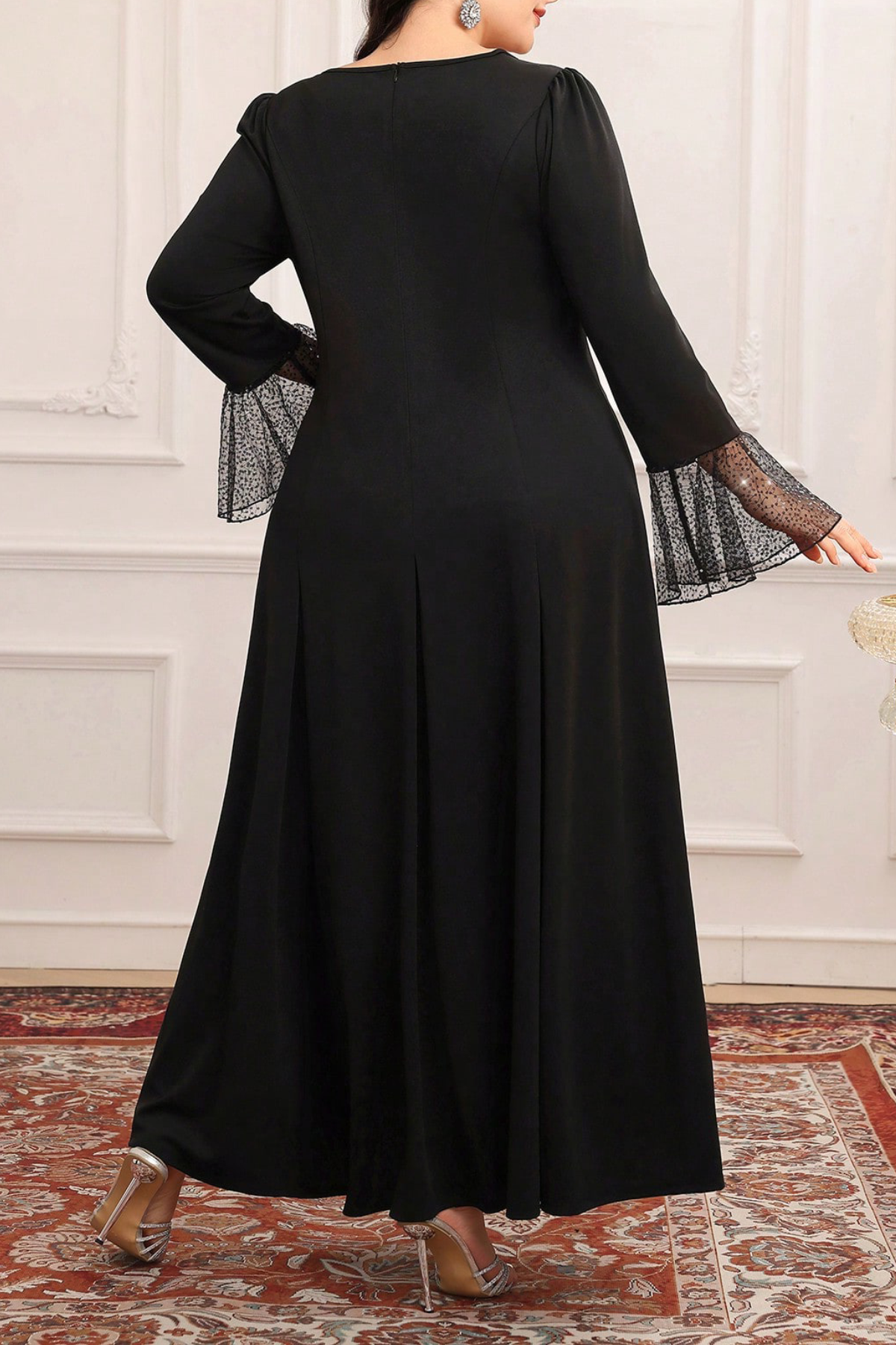 Juoda. Ilga, proginė suknelė. Suknelė liemenuota, mažesniai krūtinei ir platesniam liemeniui (žiūrėti išmatavimus). Suknelė plius dydžio moteriai. Suknelės medžiaga trikotažas, tampri, +1 cm. Nugaros pusėje – užtrauktukas. Rankovių galai ir platus sijonas priekyje, puoštas plona medžiaga, siūvynėta žvyneliais.