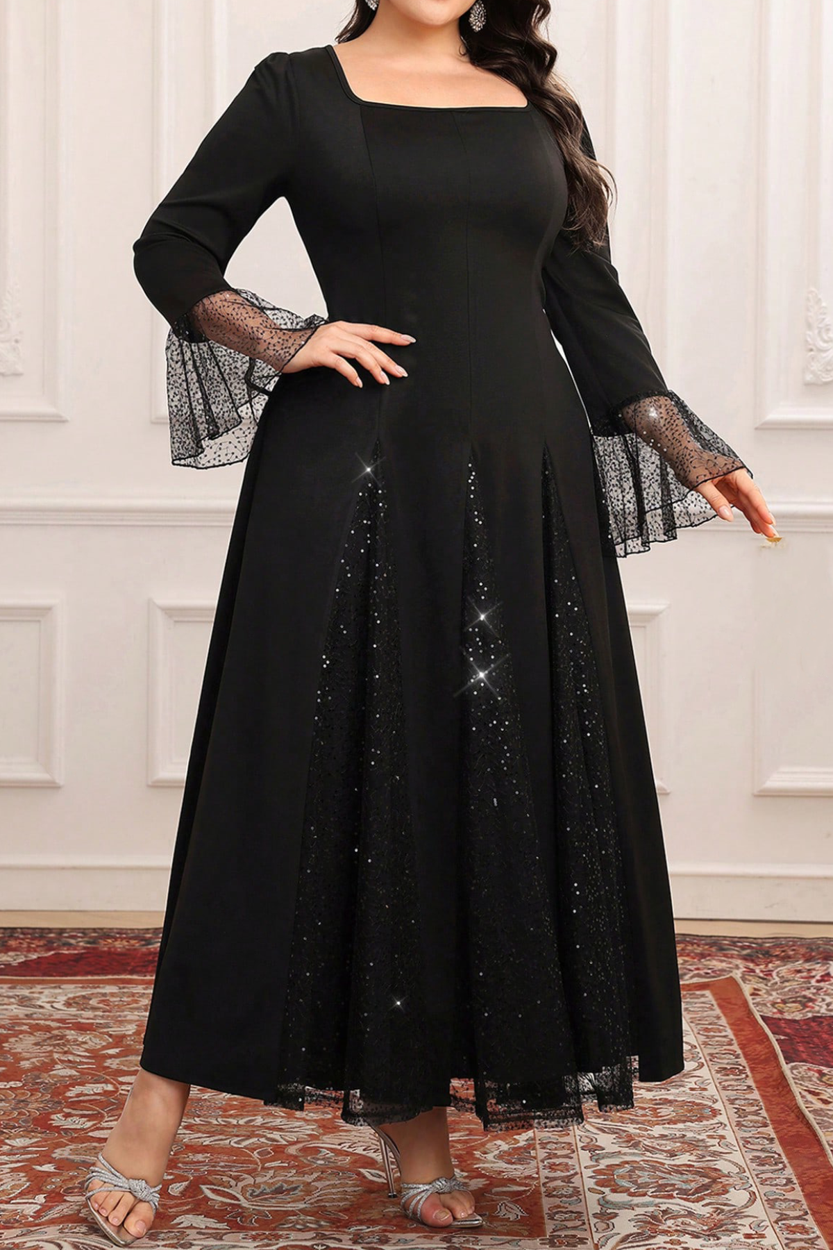 Suknelė gali būti apgulusi figūrą. Platus sijonas ir blizgi medžiaga puošia suknelę ir padaro ją labai elegantiška. Prie suknelės labai tiks didesnis vėrinys. Išmatavimai;