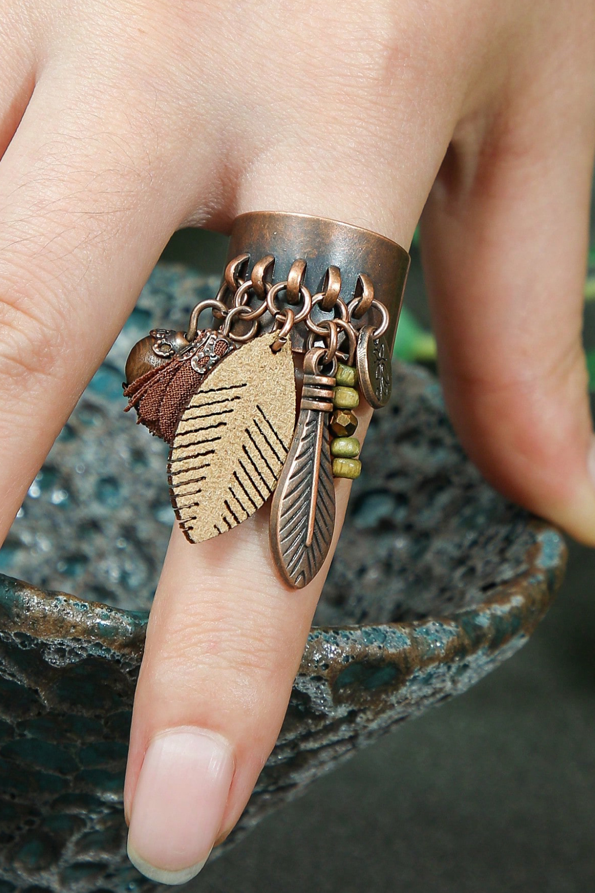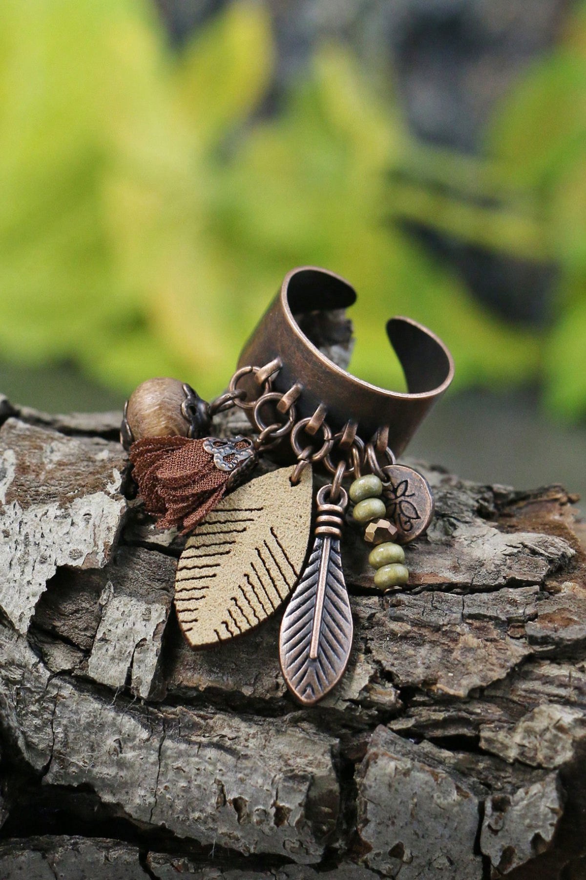 Bronzos lydinio metalinis žiedas su įvairiais papuošimais iš natūralių medžiagų; audinio, medžio, odos, stiklo karoliukų…Žiedas boho stiliaus. Žiedo dydis reguliuojamas.